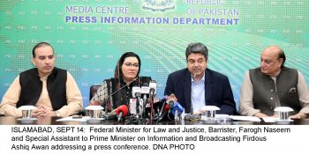 ISLAMABAD, SEPT 14 (DNA): Minister for Law and Justice Farogh Naseem has stated a number of new laws are being introduced to provide inexpensive and expeditious justice to the people and protect the vulnerable segments of the society. He was addressing a news conference in Islamabad on Saturday. Special Assistant on Information Firdous Ashiq Awan and the provincial law ministers of Khyber Pakhtunkhwa, Punjab and other were also present. The Law Minister said a Legal Aid and Justice Authority Bill is also being brought to provide legal, financial and otherRead More