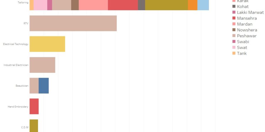 Data obtained from Vocational Education Report for 2013 for Khyber Pakhtunkhwa shows that 62 out 100 enrollments are for courses offered in electrical work, RTV and electrical technology while 24 out of 100 enrollments are for tailoring and only 1 in 100 enrollment is for a course in computers or information technology.