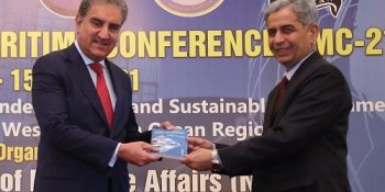 Karachi : V/Admiral Iftikhar Ahmed Rao presenting his book Elements of Blue Economy (recently published by IPS Press, the publishing arm of Institute of Policy Studies) to Pakistan’s Foreign Minister Makhdoom Shah Mehmood Qureshi and Chief of Naval Staff Admiral Muhammad Amjad Niazi in the concluding session of 9th International Maritime Conference held in Karachi from 13-15 February 2021 in the sidelines of Aman-2021 Naval Exercises participated by 45 navies from across the world.