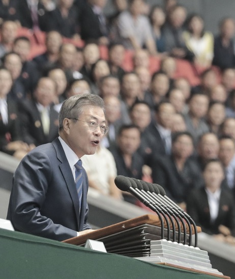 President Moon Jae-in made a live speech before 150,000 North Korean public in the May Day Stadium, which was the first-ever one by a South head of state in Pyeongyang.