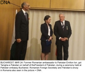 BUCHAREST, MAR 24:(DNA) Govt of Pakistan has awarded former Romanian ambassador in Pakistan Emilian ION with Tamgha-e-Pakistan during an impressive ceremony held at Pakistan embassy in Bucharest.