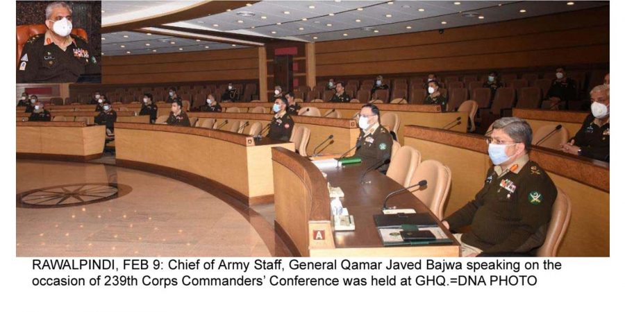 RAWALPINDI – 239th Corps Commanders’ Conference was held at General Headquarters today chaired by Chief of Army Staff (COAS) General Qamar Javed Bajwa. The participants undertook a comprehensive review of regional and domestic security environment with special focus on situation along borders, internal security and other professional matters of the Army.
