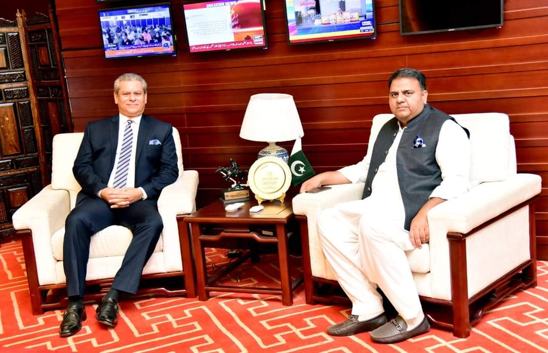 ISLAMABAD: Hamid Asghar Khan Pak ambassador to morocco call on the Minister for Information Mr. Fawad Chaudry. News sharing agreement between Pakistan and Morocco finalized. Invitation to DG Maghreb Arab Press to visit Pakistan.