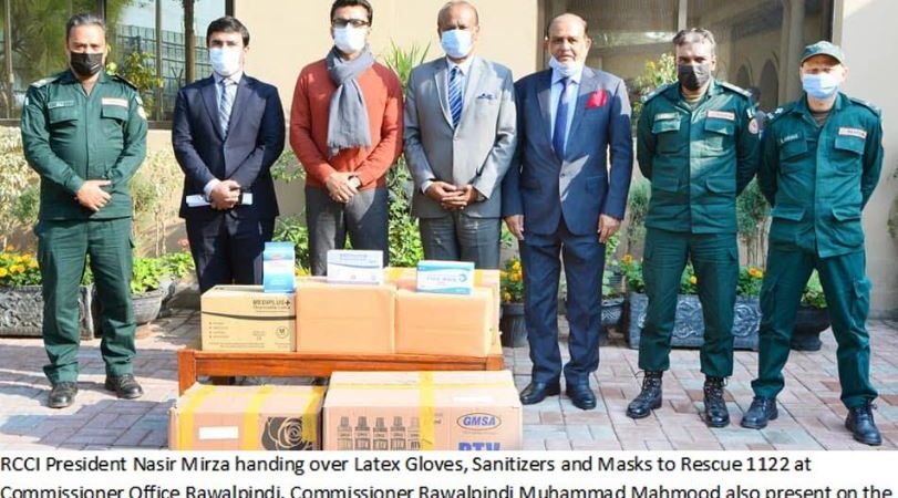 RAWALPINDI, DEC 16 (DNA) – The Rawalpindi Chamber of Commerce and Industry (RCCI) has donated latex gloves, hand sanitizers and masks to Rescue 1122 to prevent the Corona epidemic. RCCI President Nasir Mirza handed over hand sanitizers, gloves and masks to the representatives of Rescue 1122 at Commissioner’s Office Rawalpindi.
