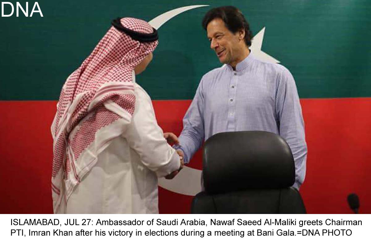 ISLAMABAD, JUL 27: Ambassador of Saudi Arabia, Nawaf Saeed Al-Maliki has greeted Chairman PTI, Imran Khan after his victory in elections during a meeting at Bani Gala.